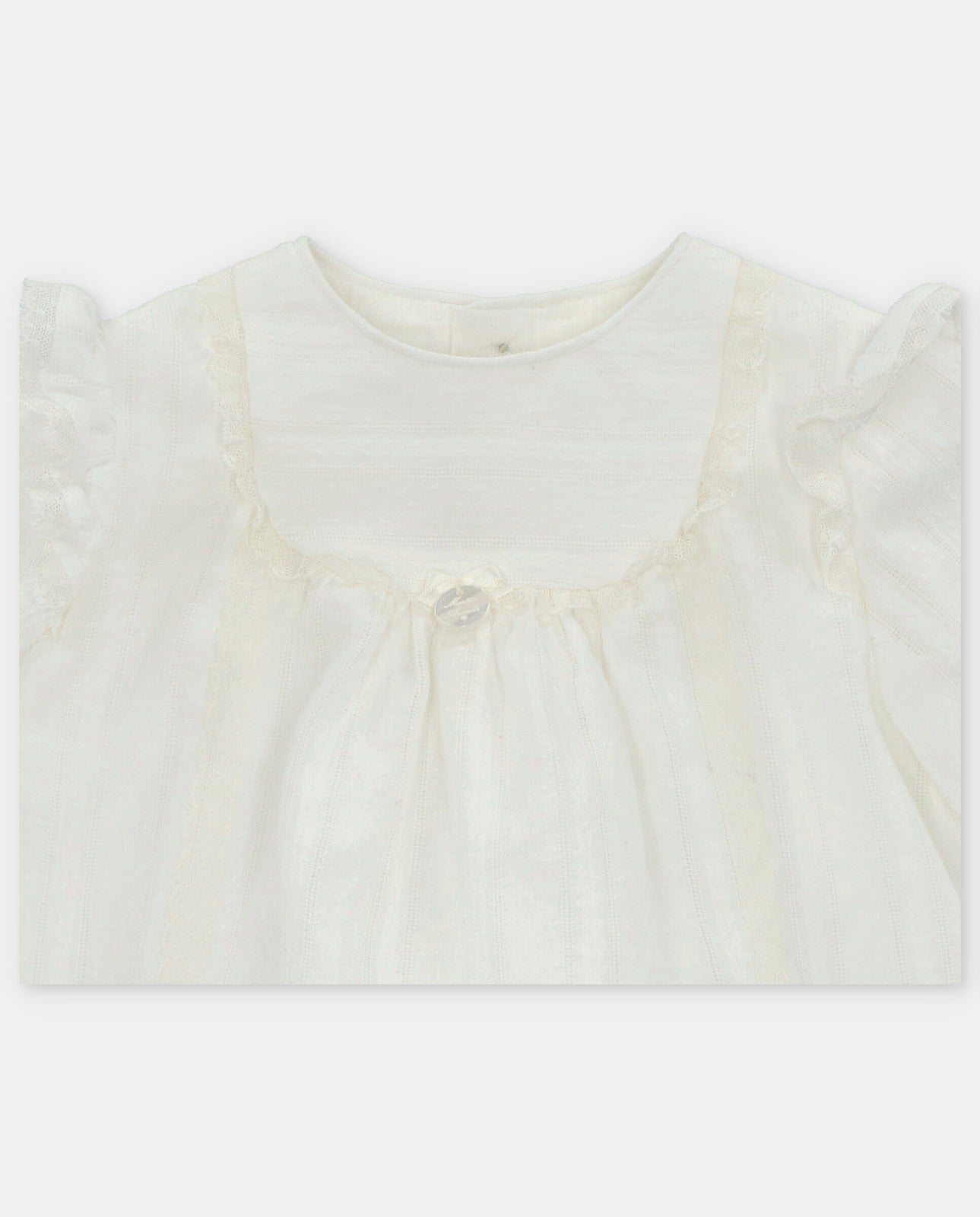 Hermoso conjunto de bautizo con detalles en bordados y sutiles encajes en tono avory.