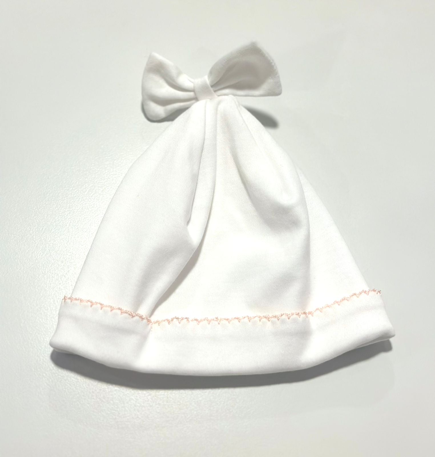 Gorrito color blanco con lazo, ideal para bebes en sus primeras puestas. 100% algodón