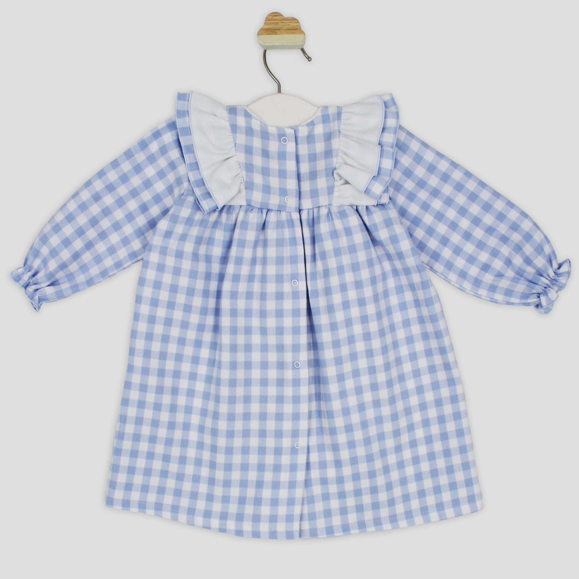 Hermoso vestido 100% algodón de cuadros Vichy, estilo corte princesa con mangas largas y detalle sutil de flecos con lazo.